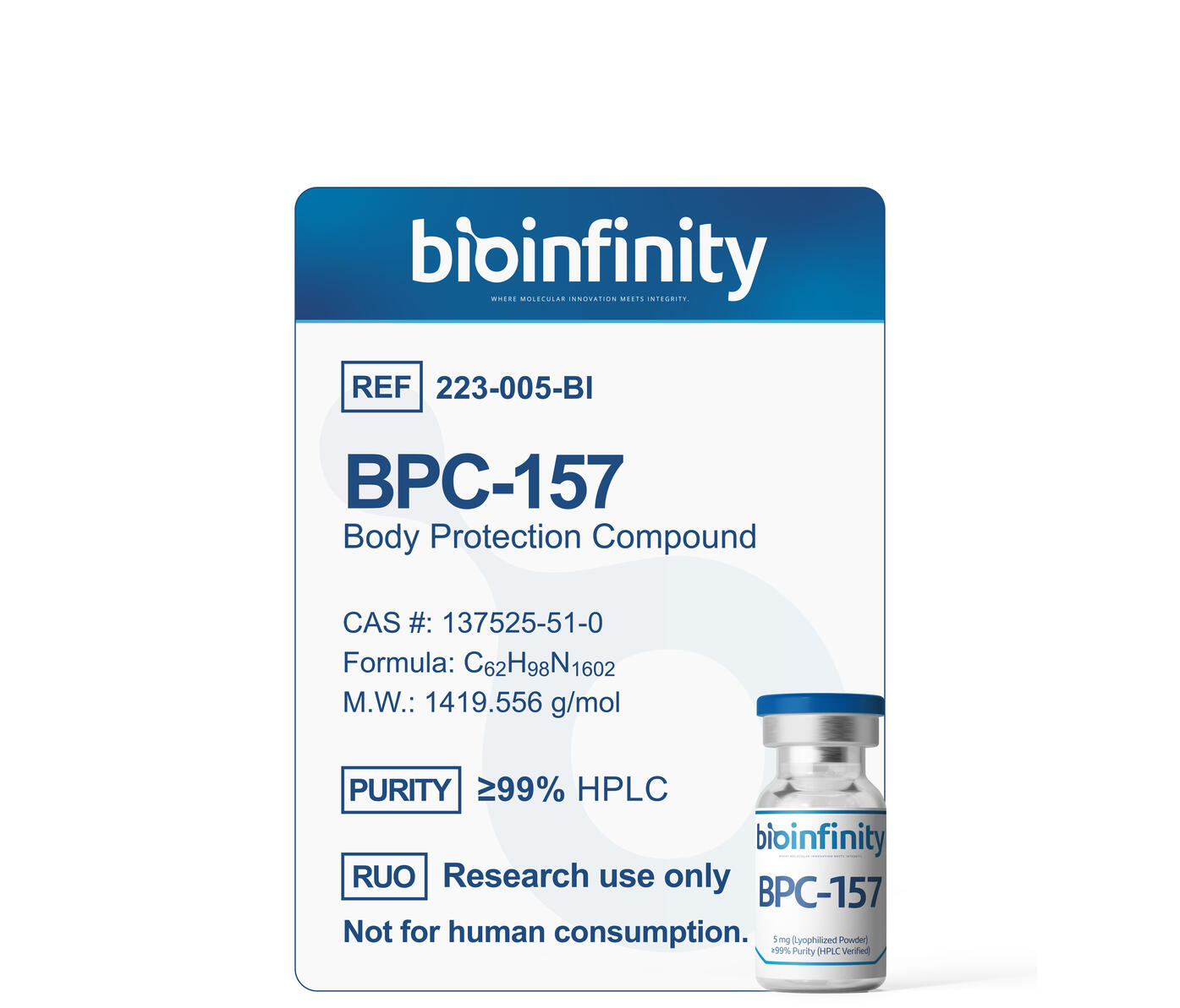 BPC-157 is a synthetic pentadecapeptide derived from a naturally occurring protein fragment identified in gastric tissue. It is widely studied in preclinical models for its interactions with cellular-repair pathways, angiogenic activity, and microcirculatory regulation.BioInfinity BPC-157 is provided as a lyophilized peptide intended solely for laboratory research involving tissue-response mechanisms, cellular signaling, and biochemical pathway analysis.