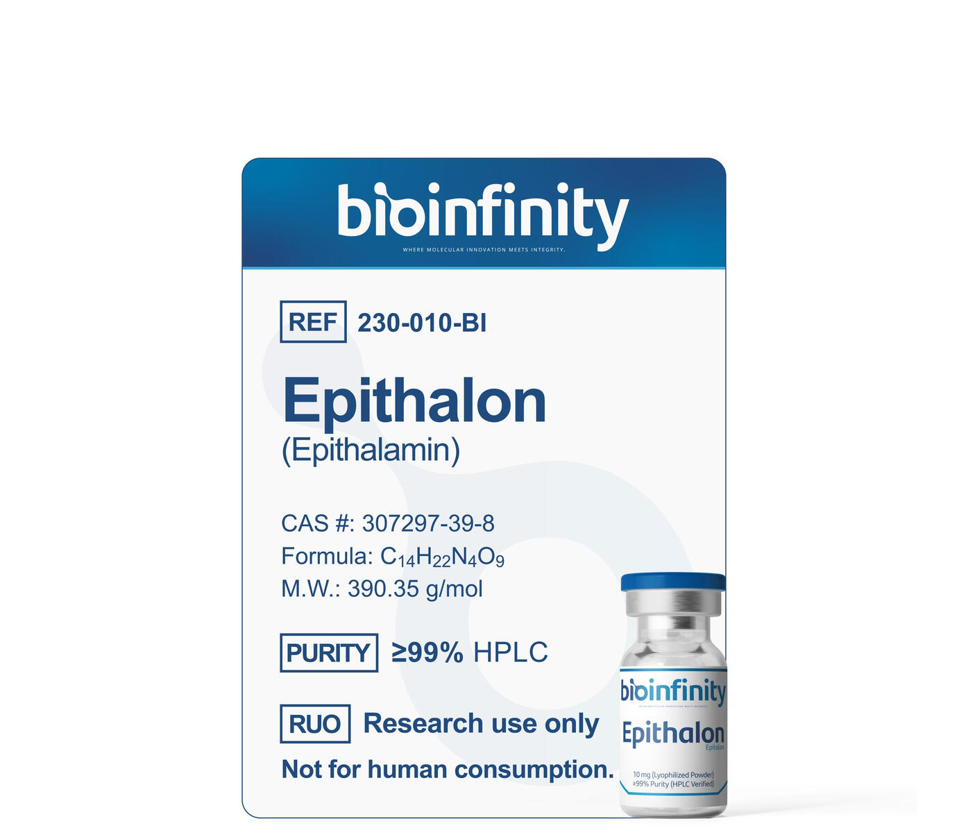 Epithalon is a synthetic tetrapeptide (Ala-Glu-Asp-Gly) derived from the natural peptide Epithalamin. It is explored in experimental aging-related research for its proposed interactions with telomerase-linked pathways and cellular regulatory mechanisms.BioInfinity Epithalon is offered as a research-grade lyophilized peptide for laboratory investigations involving cellular aging, telomere biology, and peptide-signaling models.