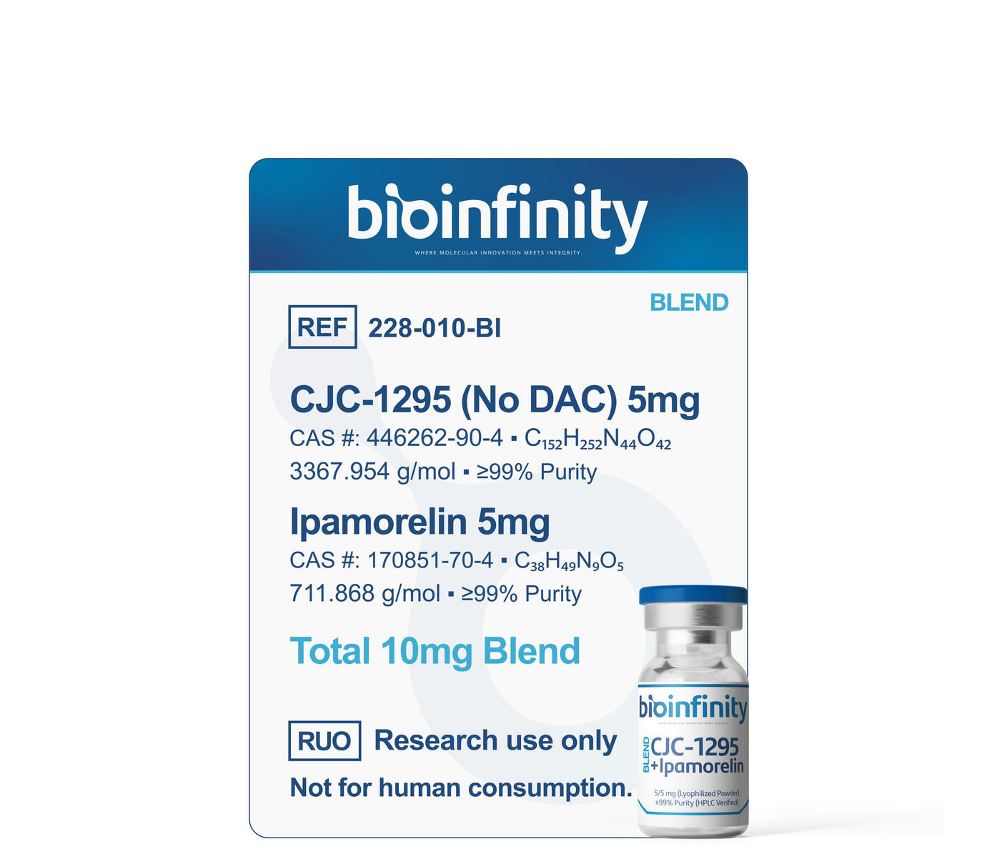 This research blend combines CJC-1295 No DAC, a GHRH analog, with Ipamorelin, a selective GHS peptide. Together, they are studied for their complementary roles in GH-signaling pathways, receptor interactions, and pulsatile endocrine behavior in controlled laboratory settings.BioInfinity CJC-1295 + Ipamorelin Blend is prepared as a lyophilized combination peptide for scientific research examining multi-pathway GH modulation. For laboratory use only.